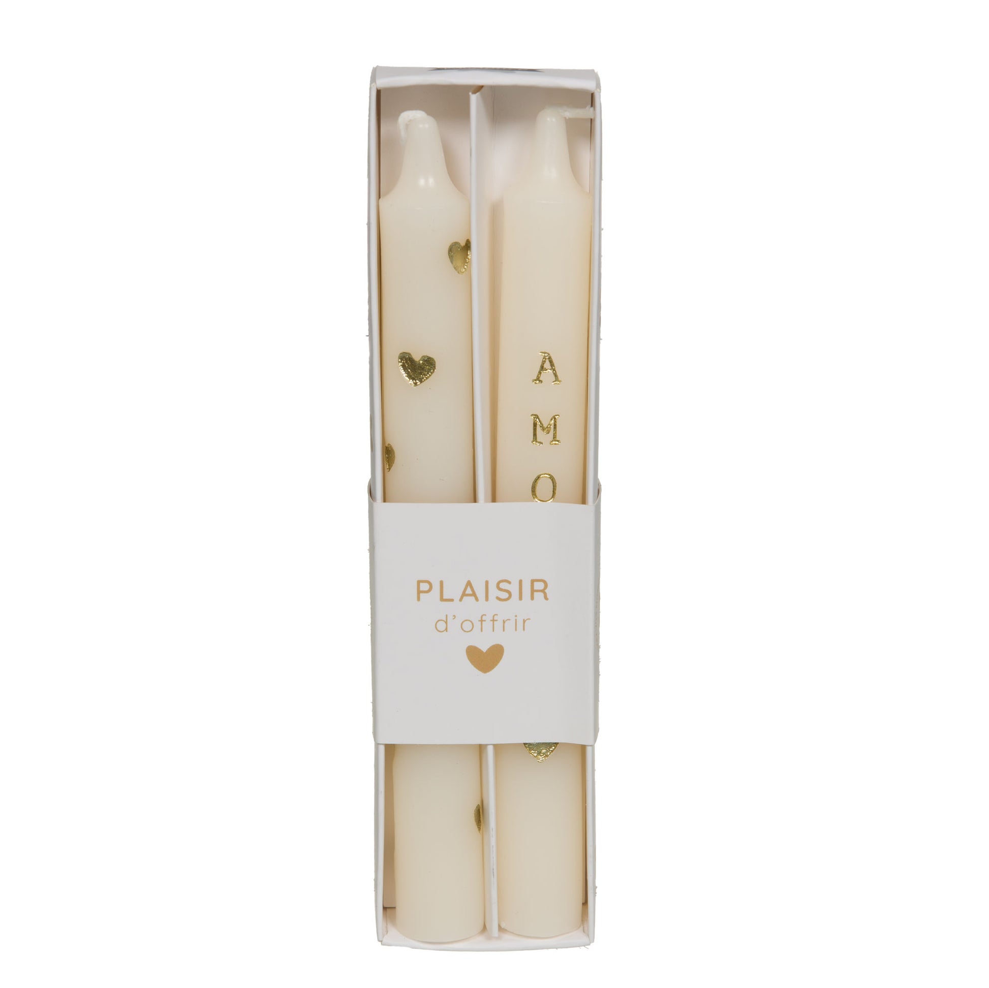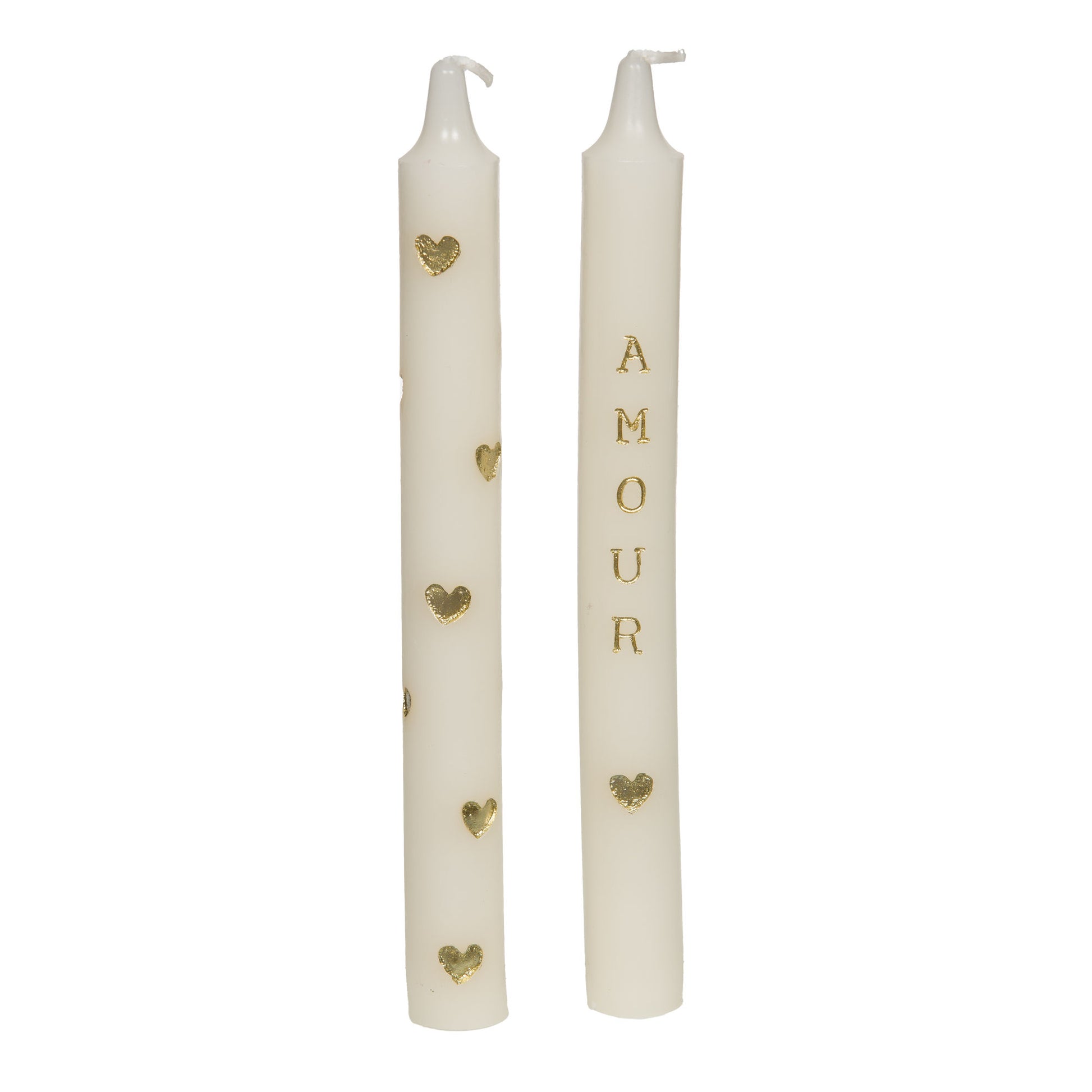 Lot de 2 chandelles décoratives « Amour Coeur » en cire minérale, hauteur 20 cm, diamètre 2 cm. Décor doré (lettres et petits cœurs) apportant une finition raffinée adaptée aux collections saisonnières et occasions romantiques (Saint-Valentin, mariages)