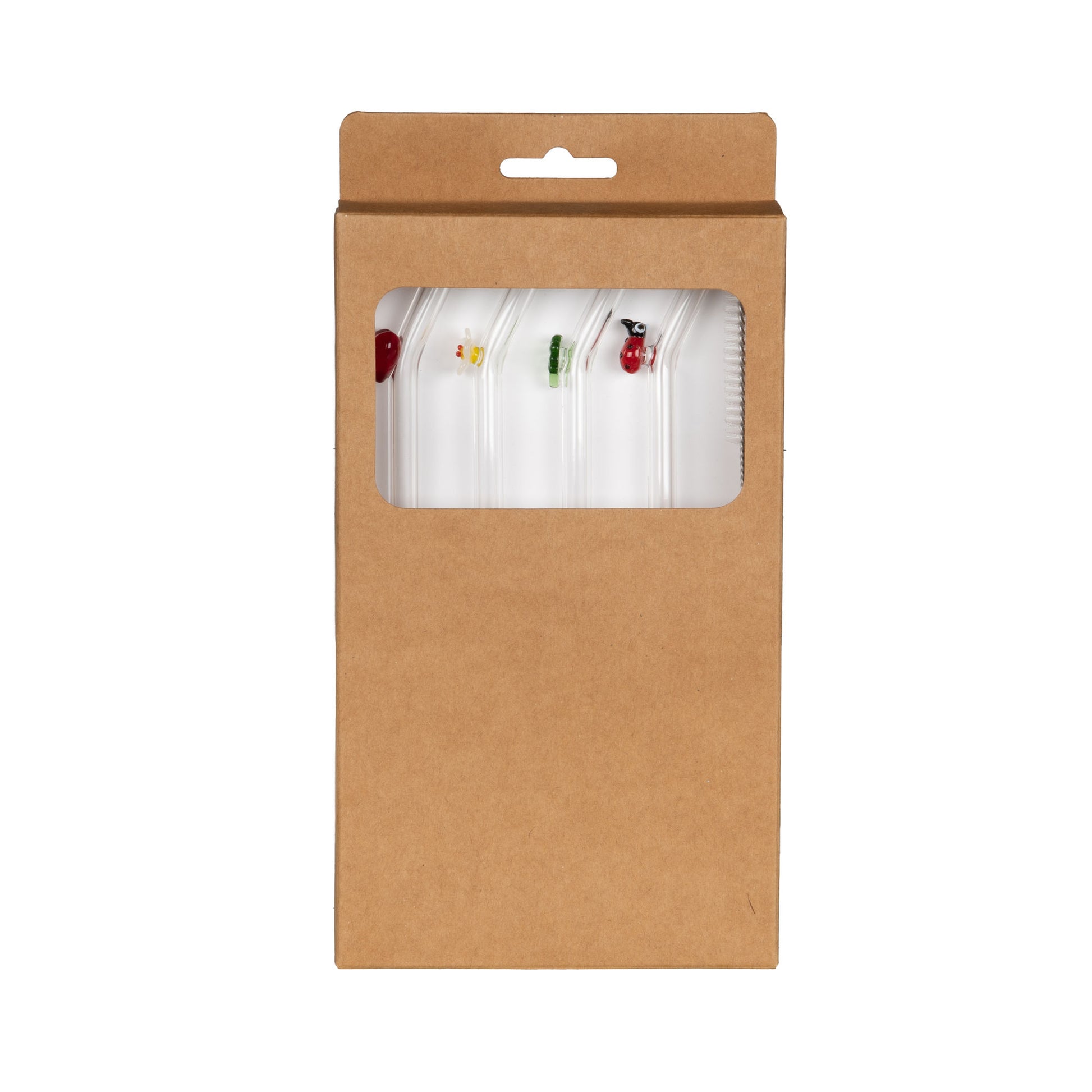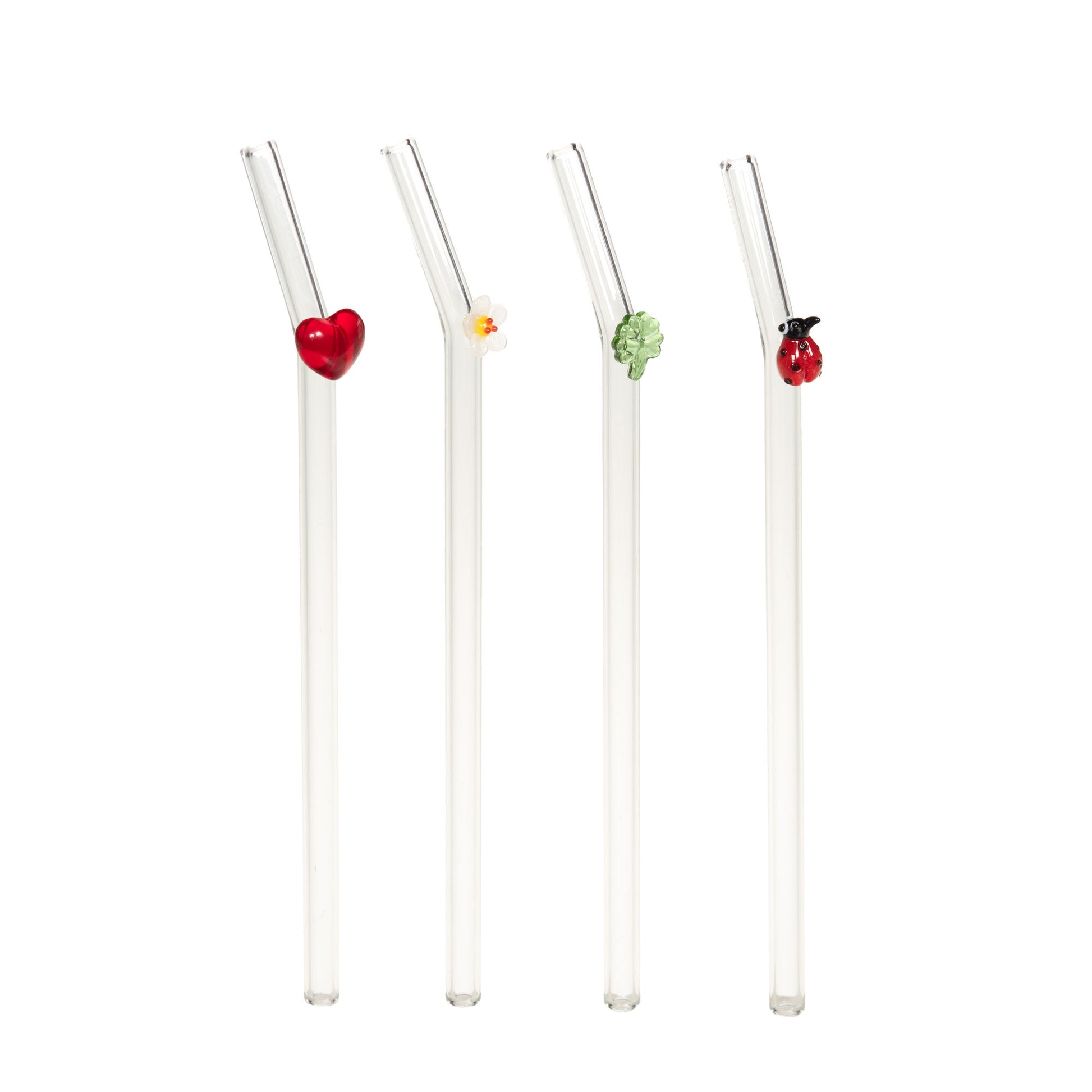 Coffret de 4 pailles en verre décorées "Chance" par Amadeus, conçu pour compléter une offre d'accessoires beverage haut de gamme. Chaque paille (H 20 cm) est en verre borosilicaté (apparence transparente) avec petite décoration colorée (coeur, fleur, trèfle, coccinelle) soudée en surface. Produit attractif pour la revente saisonnière ou cadeau, valorisable en visuel produit et catalogues. Prix unitaire par assortiment.