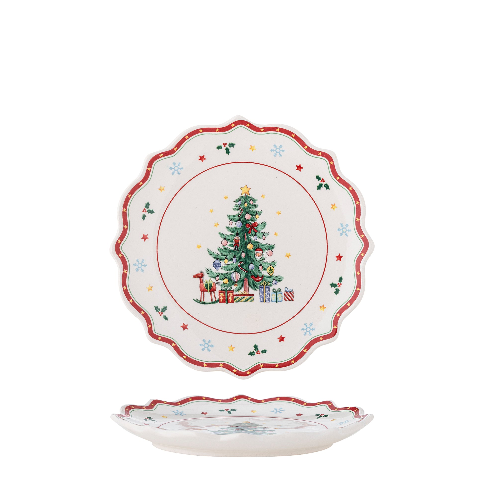 L'assiette Naive de Bloomingville charme avec son motif détaillé d'arbre de Noël et ses figurines classiques de fête. L'esthétique de l'assiette est renforcée par un bord rouge peint à la main, qui non seulement ajoute une touche festive, mais met également en valeur de manière élégante sa forme ondulée. Ces détails peints à la main assurent que chaque assiette est unique.
