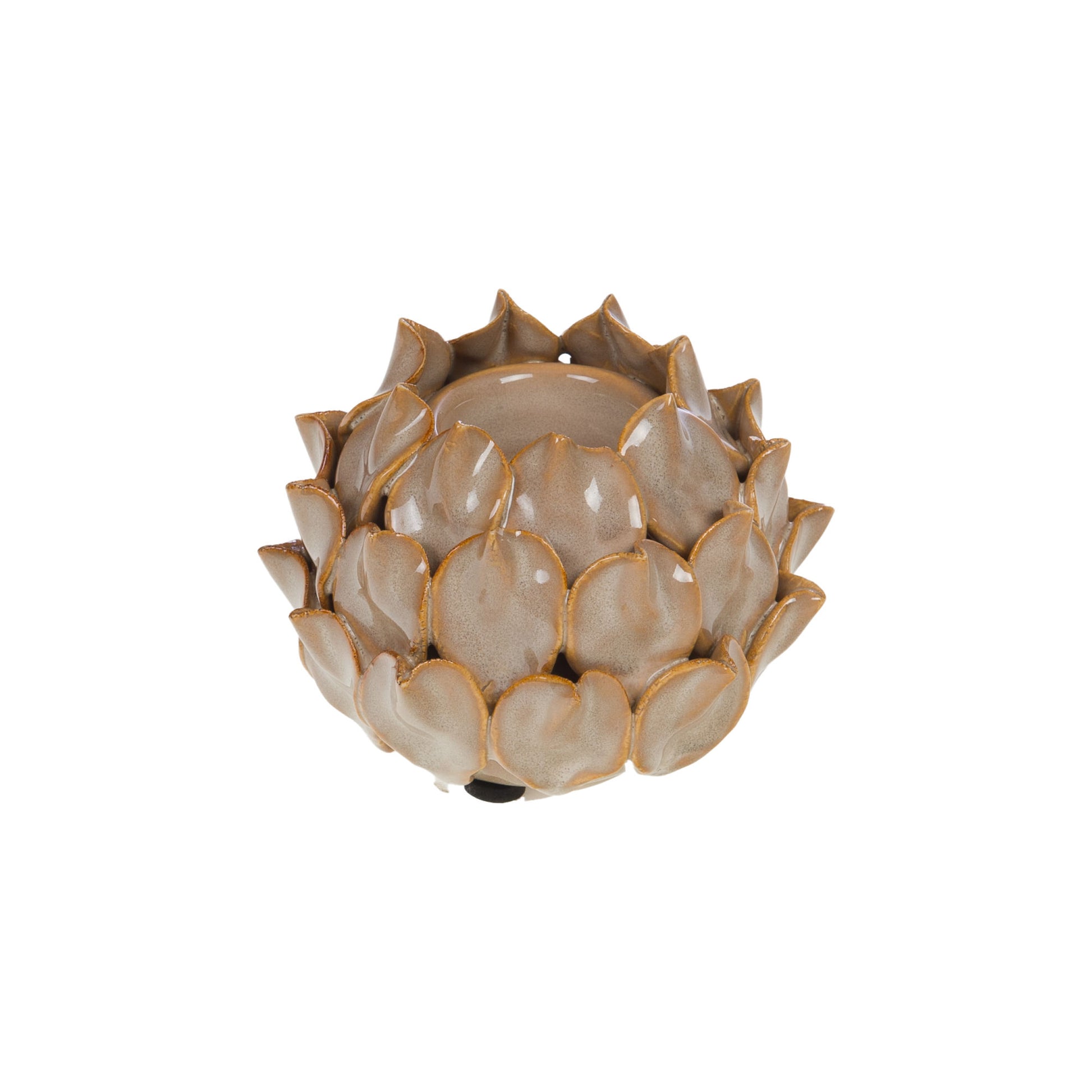 Bougeoir en céramique de petite taille (11x11x10 cm), au design original inspiré de la nature avec une forme évoquant une fleur ou un artichaut. Ce modèle "Laurel PM" séduit par sa finition brillante et ses détails travaillés, idéal pour enrichir une gamme d'accessoires décoratifs raffinés. Léger et facile à intégrer, il apporte une touche d'élégance subtile à toute offre bougeoirs.