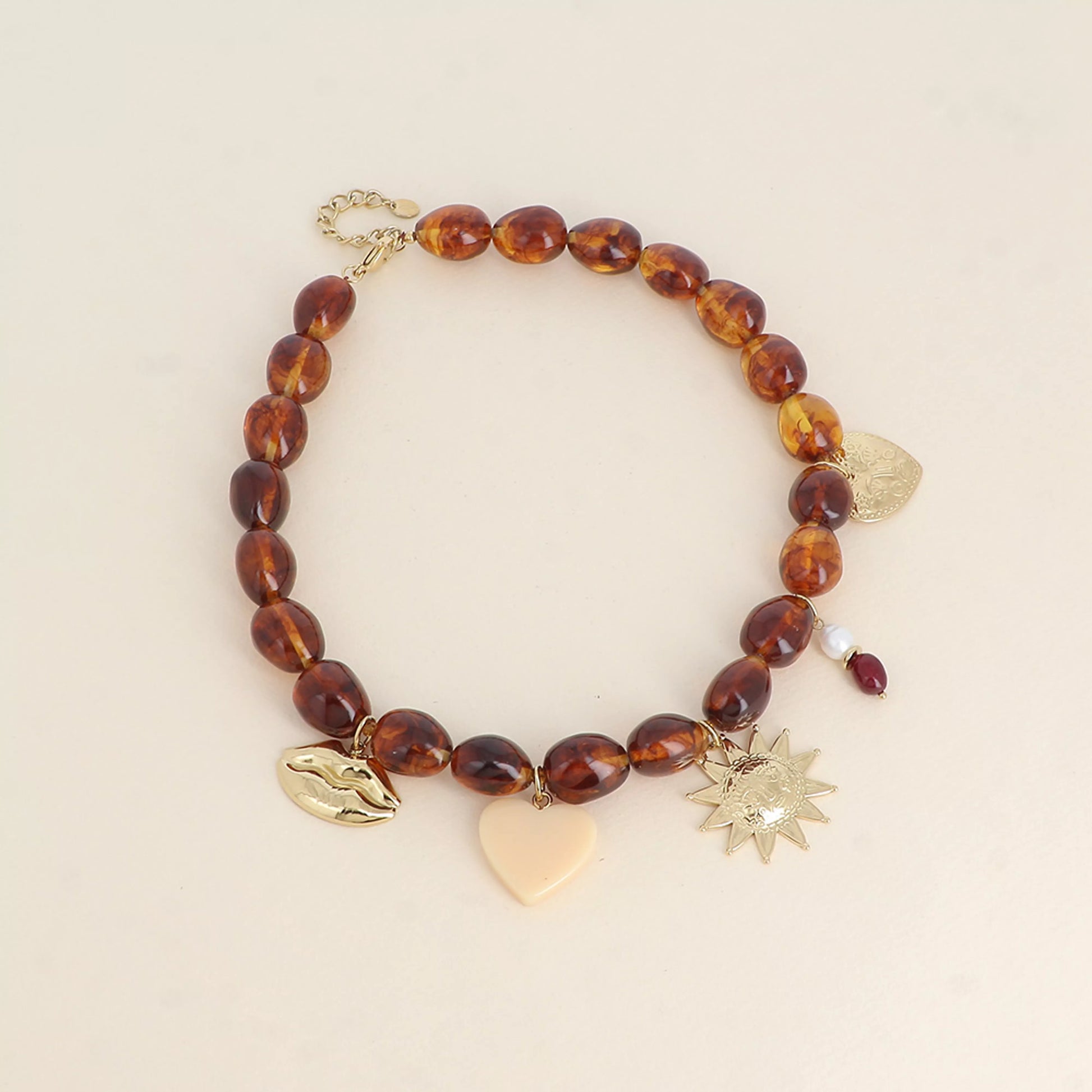 Collier sur fil orné de perles en résine et de breloques en acier inoxydable (bouche, soleil, coeur, coeur en résine et pierres naturelles).