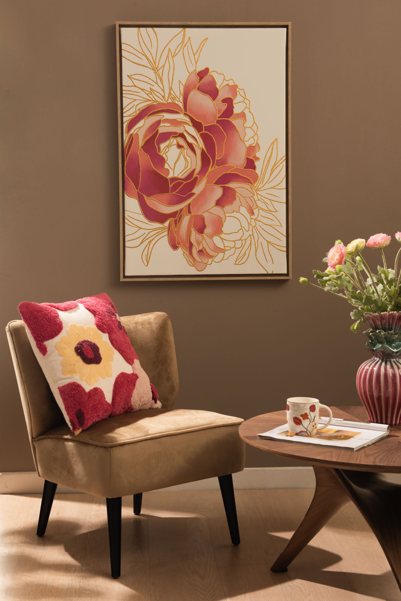 Coussin décoratif 'Pixie' 45x45 cm, enveloppe 100% coton, garnissage fibre (syntétique). Design floral texturé fuchsia avec touches crème et jaune, apportant couleur et relief aux collections textiles.