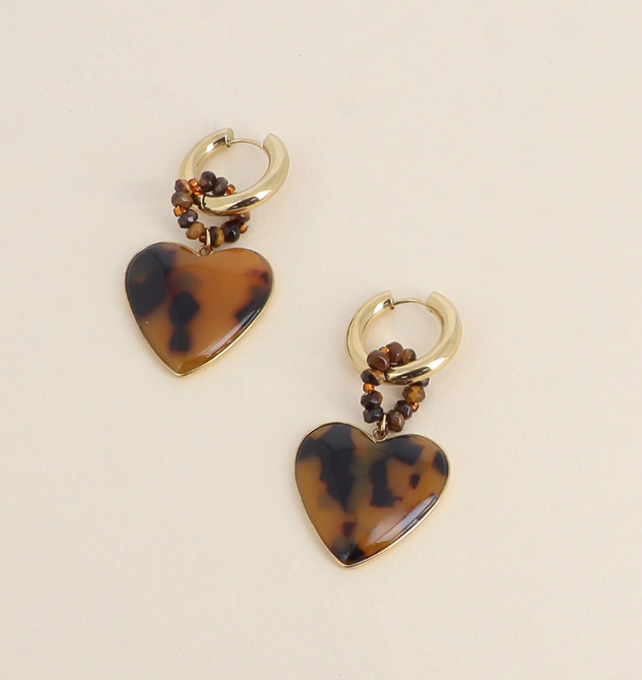 Boucles d'oreilles type créoles avec fermoir à charnière en acier inoxydable composées d'un anneau de pierres naturelles et d'un coeur en résine.