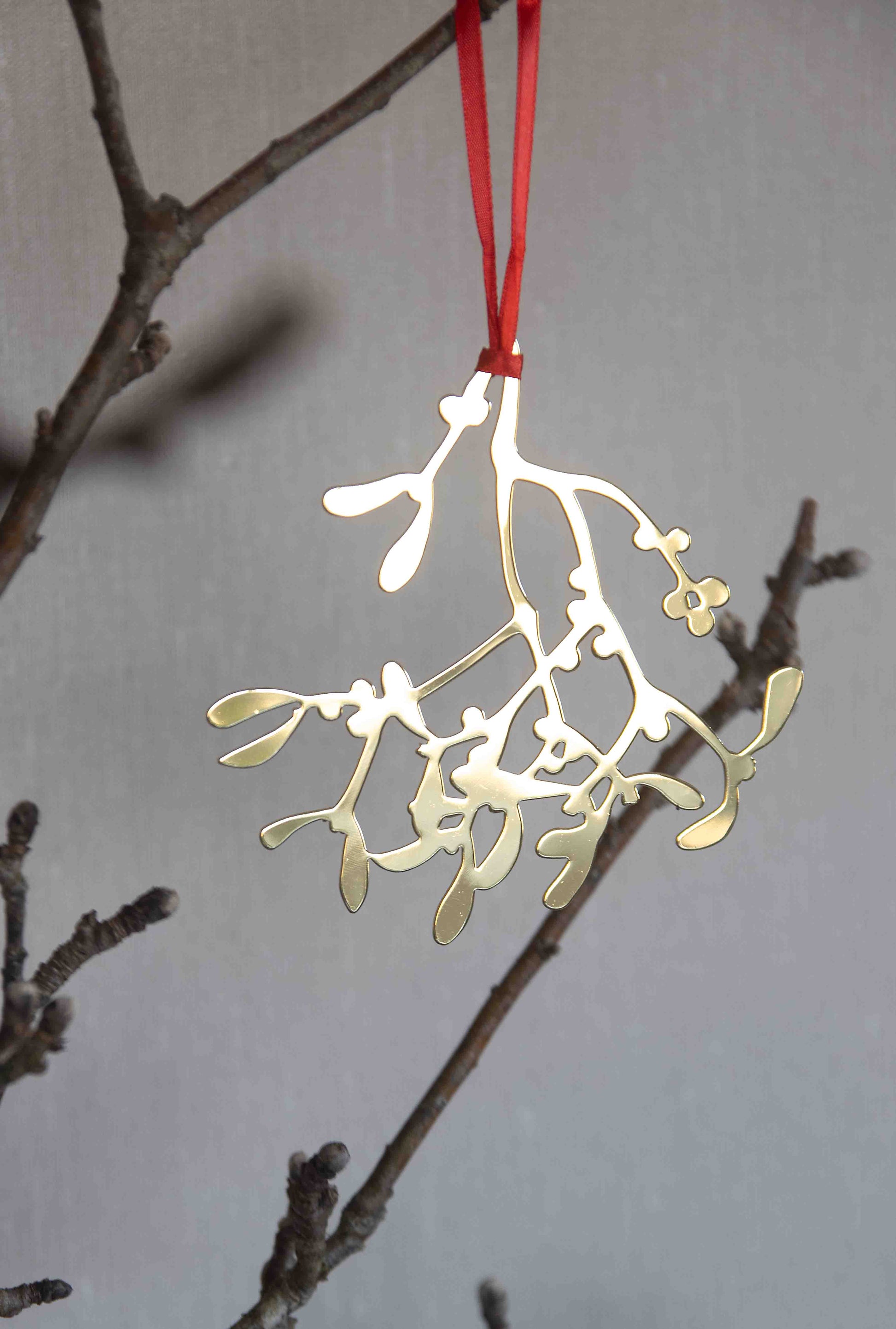 Une élégante décoration suspendue en métal doré, en forme de gui stylisé en silhouette. Parfait pour accrocher à la porte, au sapin de Noël ou à la fenêtre.