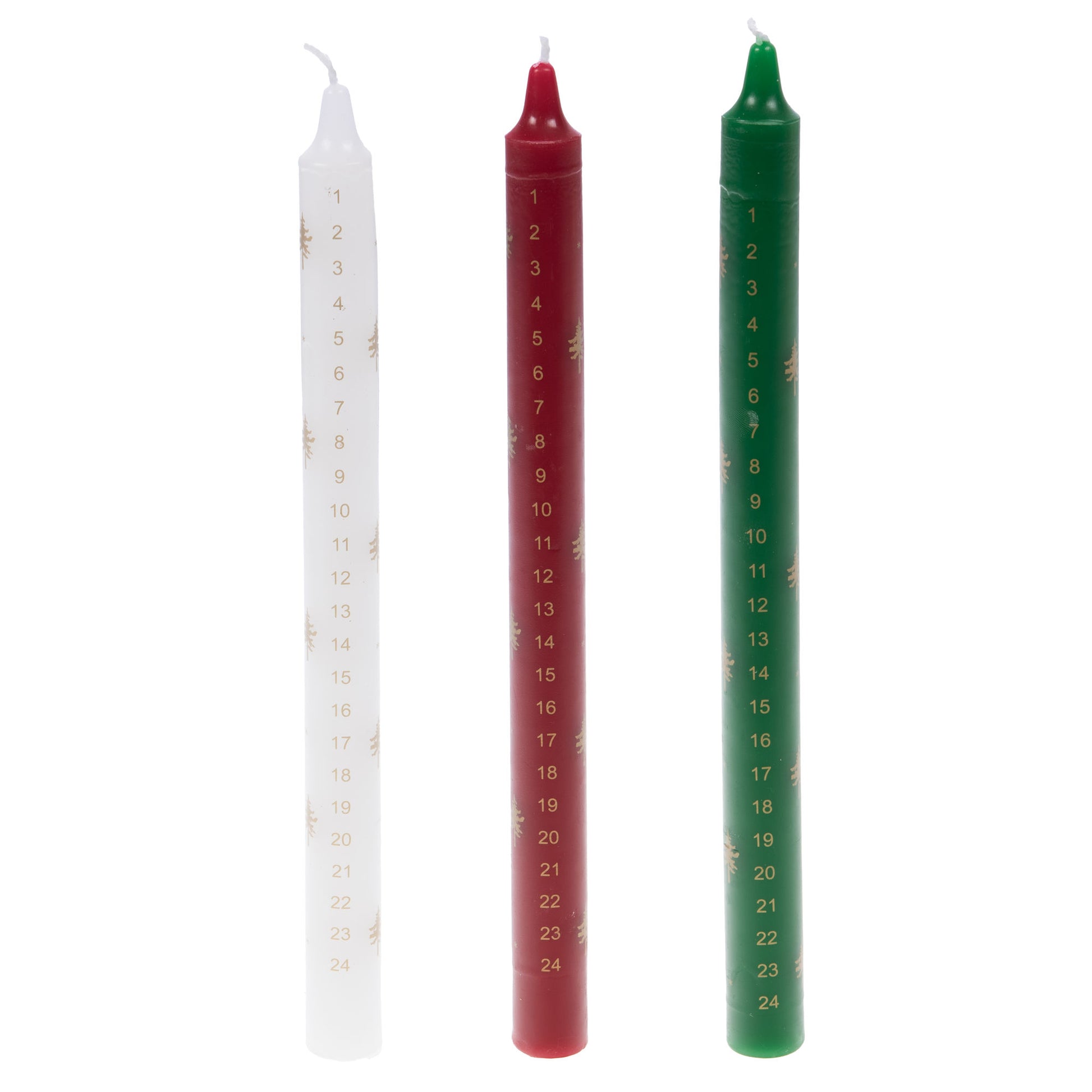 Lot de trois bougies flambeau en paraffine, aux couleurs traditionnelles de Noël (blanc, rouge, vert). Chaque bougie fine (2 cm de diamètre) et haute (30 cm) est numérotée de 1 à 24, idéale pour un calendrier de l'Avent décoratif. Produit signé Amadeus, parfait pour enrichir une gamme de bougies décoratives saisonnières, avec un poids léger facilitant la présentation et la vente.