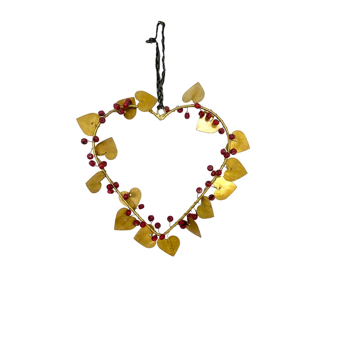 Très joli coeur en laiton orné de pampilles petits coeurs et perles de bois rouge. Il sera parfait pour apporter une touche de deco festive dans la maison.