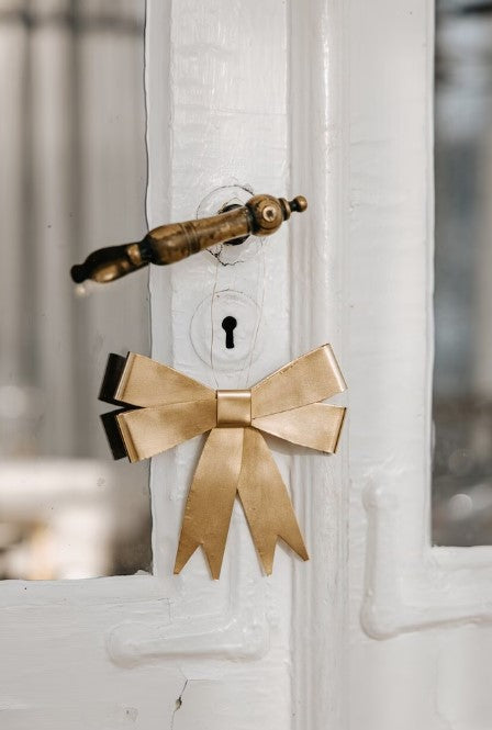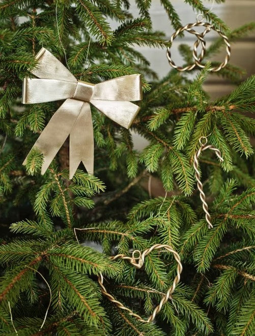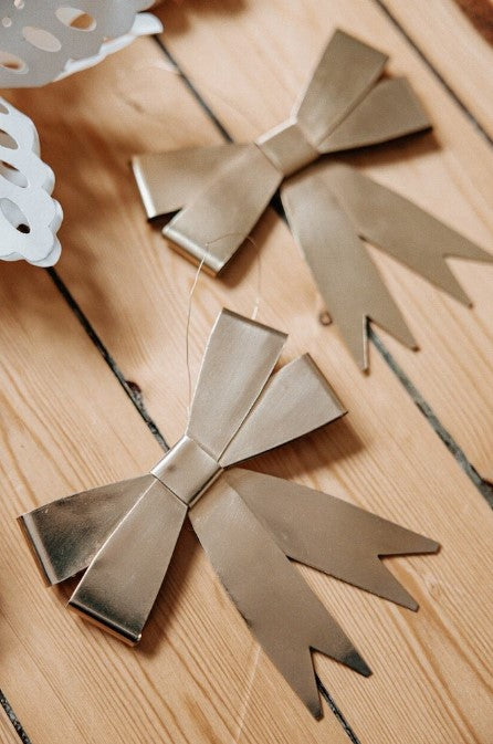 Petite décoration décorative en laiton, en forme de ruban. Facile à accrocher dans le sapin, grâce au fil de laiton inclus. Elle peut également être utilisée comme détail festif sur une couronne ou comme un bel ornement sur la fenêtre.