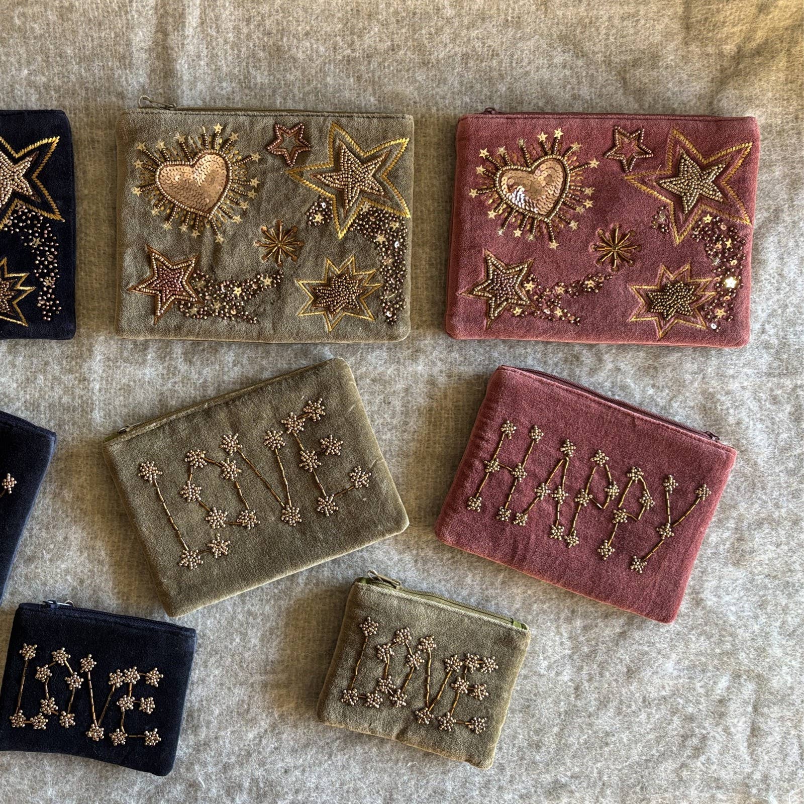 Pochette en velours de coton brodée du mot HAPPY en perles de laiton; Coloris bois de rose