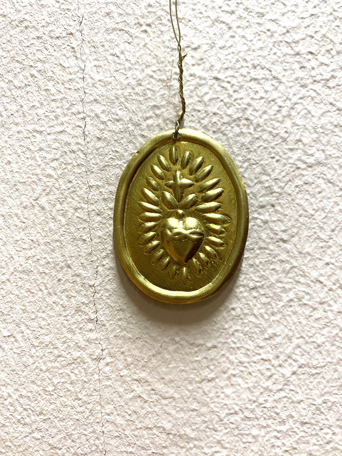 Ce pendentif décoratif en forme de médaillon est fabriqué à la main en laiton. Il est orné d'un cœur.