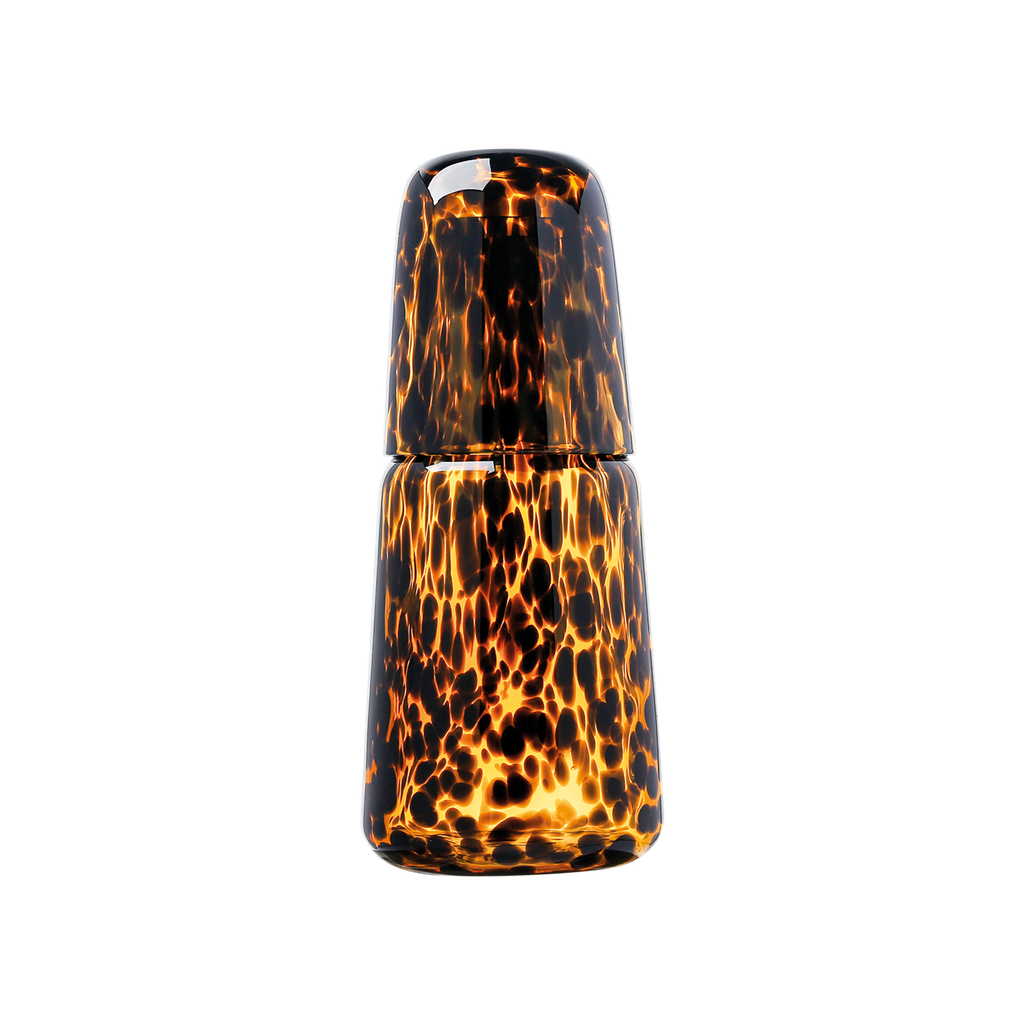 Un service malin et élégant en verre: une bouteille surmontée d’un verre retourné, prêt à l’usage. Idéal de jour comme de nuit, avec son design moucheté unique qui allie praticité et style.