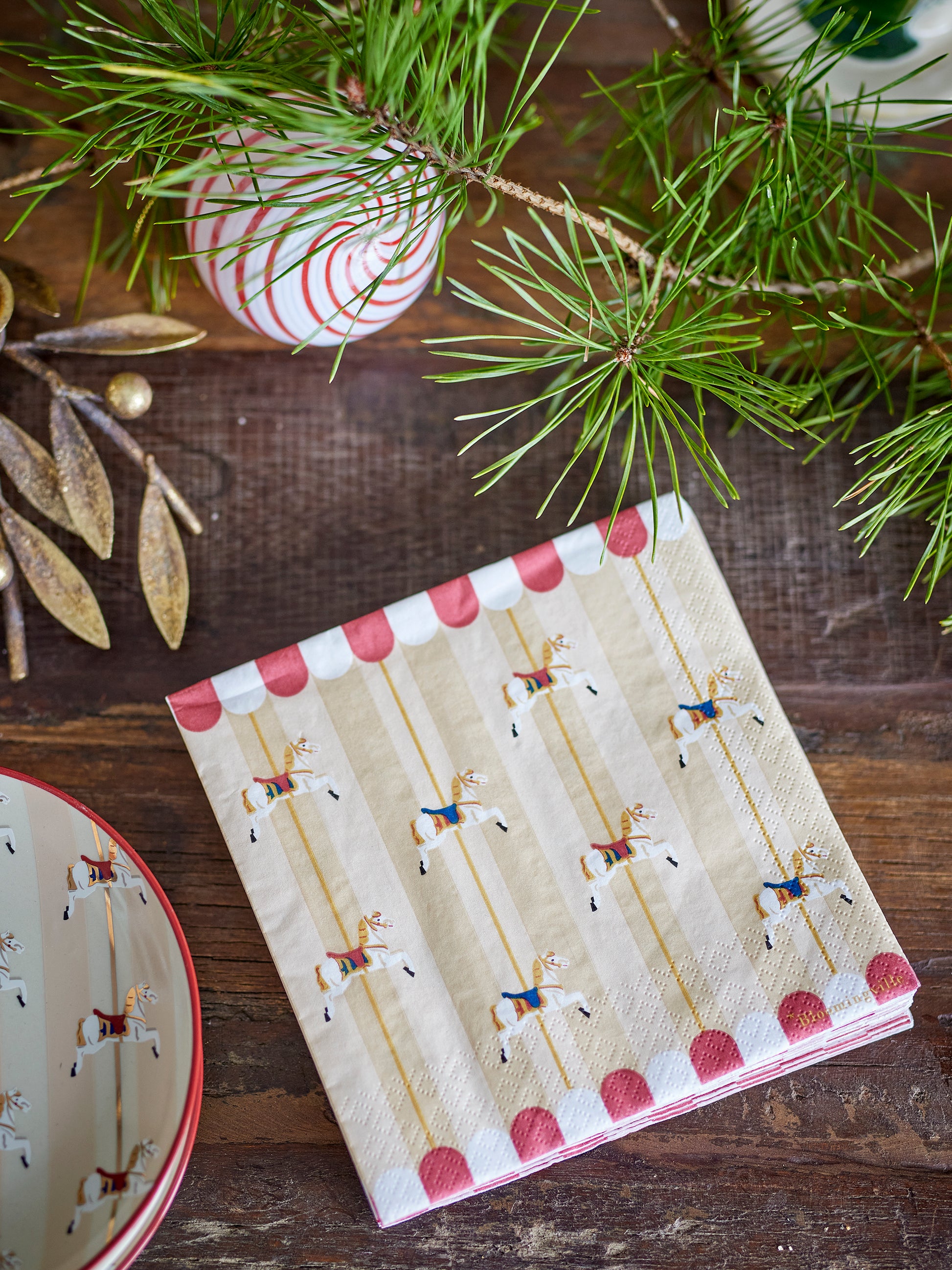 Les Serviette Merry-go-round de Bloomingville sont un paquet de 20 belles serviettes en papier, ornées de divers motifs de carrousel. Ces serviettes ajoutent une touche ludique et nostalgique à la table de Noël ou à d'autres occasions festives, créant une atmosphère cosy.