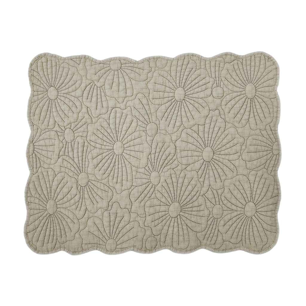 Set de table en tissu matelassé aux bords ondulés, avec un motif fleurs brodé.